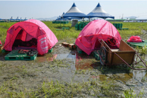 では、韓国の組織委員会はどうしたのか。排水できない泥の上にプラスチック製パレットをおいてテントを設置させた。