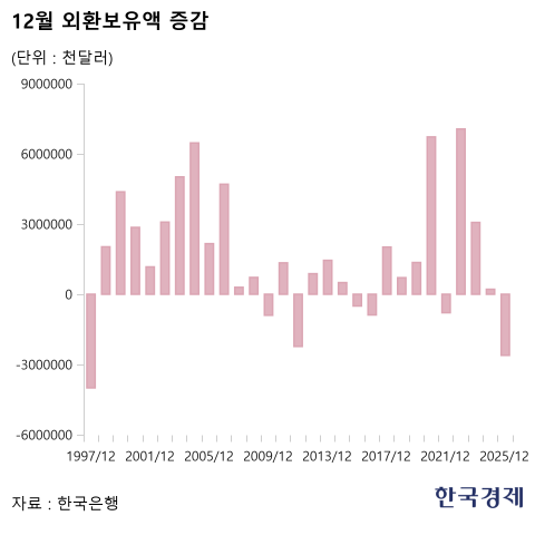 6日、韓国銀行が発表した「2025年12月末の外貨準備高」によると、12月末基準の韓国の外貨準備高は4,280億5,000万ドル(=約66兆7,700億円)と集計された。11月の4,307億ドル(=約67兆1,000億円)に比べて26億ドル(=約4,000億円)の減少だ。このような減少幅は歴代の12月基準で2番目に大きい。通貨危機があった1997年12月に記録した40億ドル(=約6,200億円)減少から28年ぶりの最大幅だ。