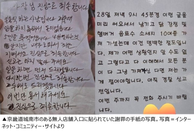10日、あるインターネット・コミュニティー・サイトに、京畿道城南市の無人店舗入口に貼られた謝罪の手紙を撮っ